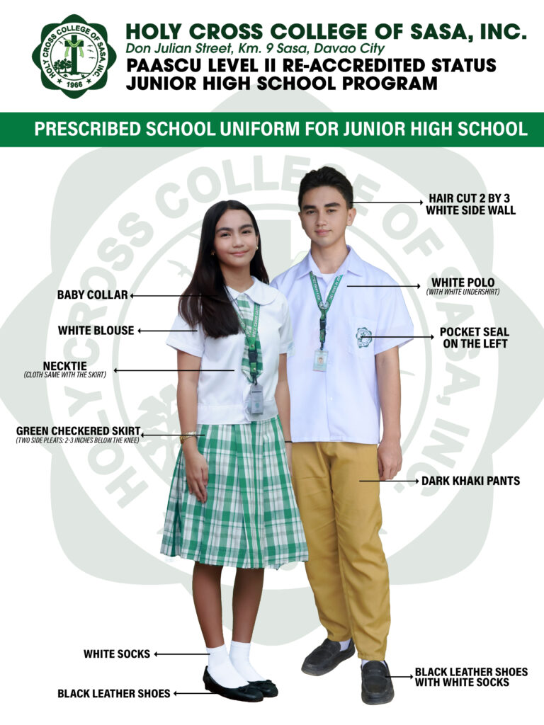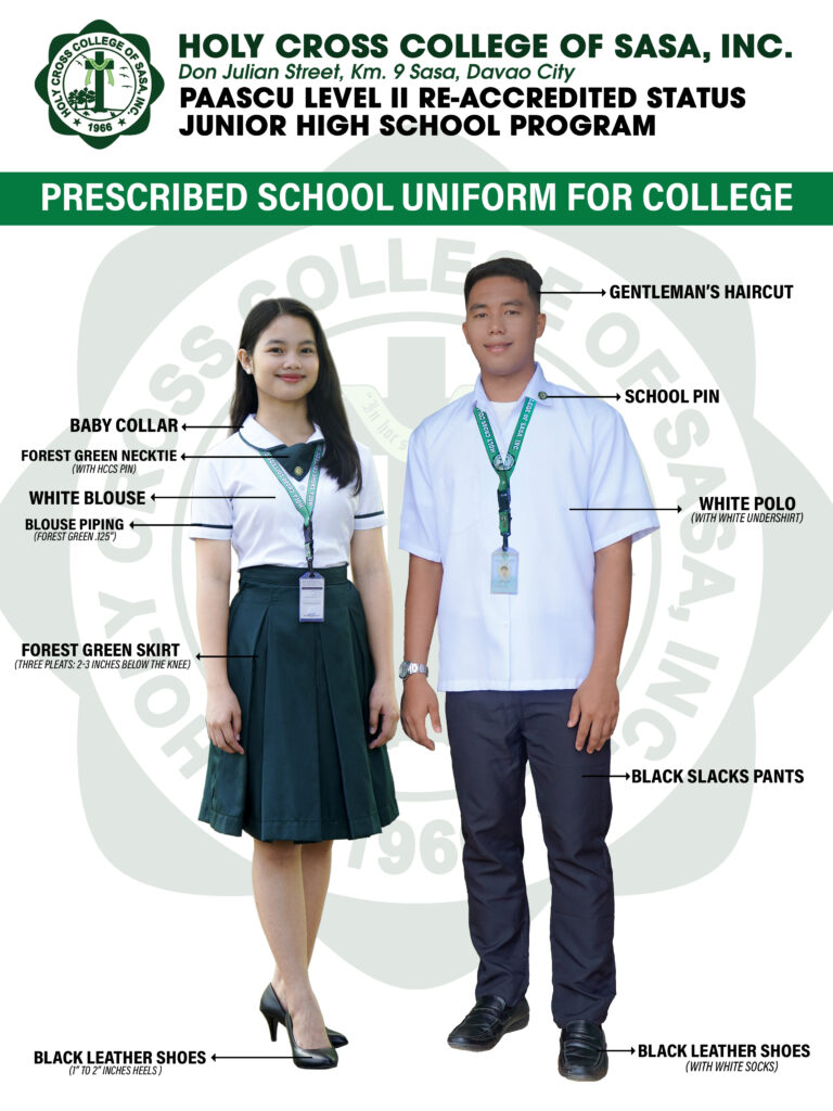 Prescribed school uniforms for Junior High School, Senior High School, and College.